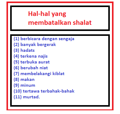 14 perkara yang membatalkan shalat. Kejatuhan najis apabila tidak di buang seketika dan najis tersebut tidak terbawa. Segala sesuatu yang keluar dari kemaluan depan maupun belakang. Hal yang membatalkan shalat itu ada sebelas perkara. Hadas kecil atau pun hadas besar.