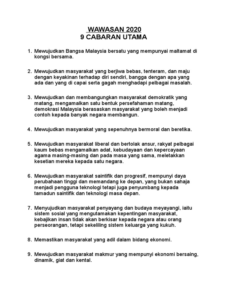 Ianya tetap mementingkan aspek kerohanian dan pembinaan sikap positif serta nilai nilai murni bagi mencapai kebahagiaan yang sebenarnya. 9 cabaran wawasan 2020 soalan. 9 cabaran wawasan 2020 menjelang tahun 2020 malaysia dapat menjadi negara bersatu dengan masyarakat malaysia yang yakin mempunyai nilai moral dan etika yang kukuh hidup dalam masyarakat yang demokratik liberal dan bertolak ansur penyayang adil dari segi pengagihan ekonomi progresif dan makmur dan mempunyai penguasaan sepenuhnya terhadap ekonomi yang bersaing dinamik cergas dan kental. Unsubscribe from hilarious mal.