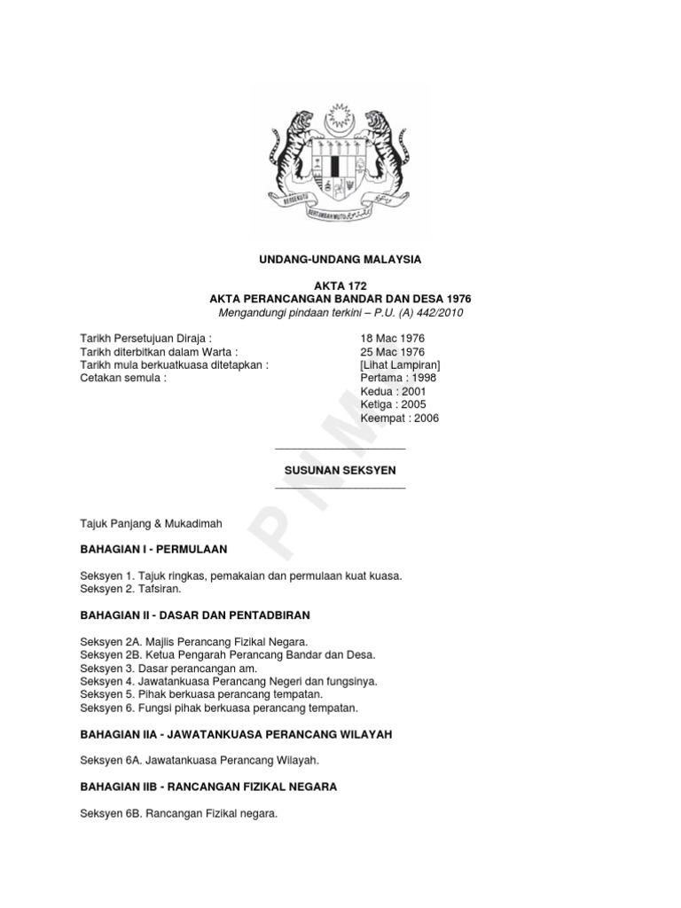 A 442 2010 tarikh persetujuan diraja. Akta 172 akta perancangan bandar dan desa 1976 susunan seksyen b ahagian i permulaan seksyen 1. Majlis perancang fizikal negara 2 b. Akta 172 akta perancangan bandar dan desa 1976 mengandungi pindaan terkini p u.