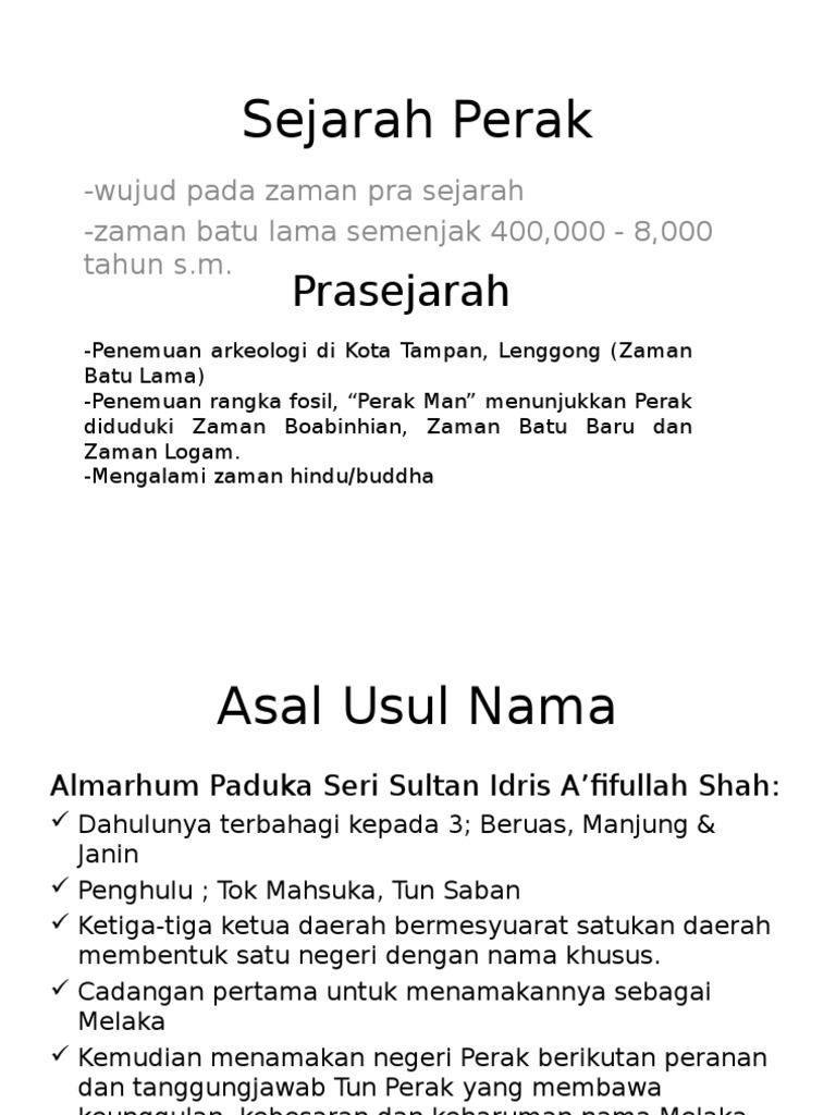 Dalam post kali ini saya akan berkongsikan beberapa sumber yang menceritakan mengenai sejarah asal usul negeri perak ini. Suatu contoh menarik dapat diperhatikan dalam meneliti asal usul nama negeri perak seperti yang terakam dalam sejarah ringkas negeri perak hlm. Portal rasmi kerajaan negeri perak. 6 17 2013 1 comment perak telah ter bukti wujud pada zaman pra sejarah lagi.