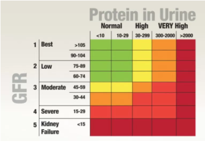 Kreatinin wujudnya protein secara berterusan dalam air kencing adalah tanda awal penyakit ginjal kronik. Namun jika protein didapati secara berlebihan di dalam air kencing ia dikenali sebagai proteinuria protein dalam urin dan ini selalunya tanda awal kepada penyakit buah pinggang. Untuk kes protein dalam air kencing bersifat ringan atau sementara biasanya tidak memerlukan rawatan. Hantar sampel anda segera atau kurang dari 2 jam kerana sampel air kencing boleh berubah menjadi alkali apabila terdedah lama bakteria akan menukarkan urea kepada ammonia.