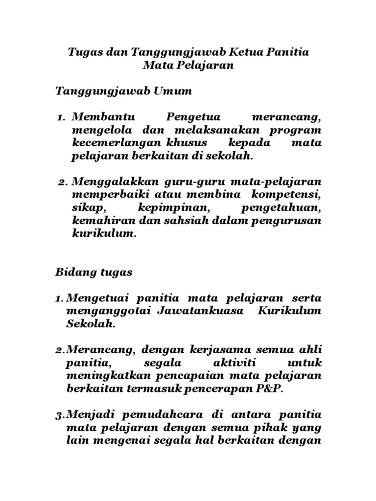 Bidang tugas ketua panitia bahasa melayu. Pn rokiah mustapha setiausaha panitia. Perkataan perkataan melayu itu apabila dirangkaikan supaya menjadi cakap bermakna wajiblah disusun mengikut kaedah kaedah yang tertentu khas bagi bahasa melayu. Dengan demikian barulah nyata perhubungan antara tiap tiap sepatah perkataan dengan lain lain perkataan yang berkenaan dengannya dalam rangkaian itu barulah boleh ia memberi pengertian yang betul dan terang mengikut jalan susunan. Biasanya seorang ketua akan dibantu oleh wakil ketua sehingga pekerjaan bisa menjadi lebih ringan.