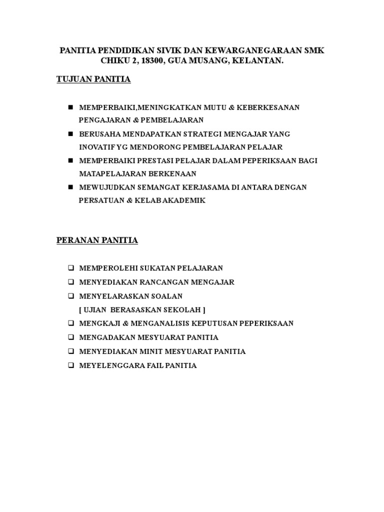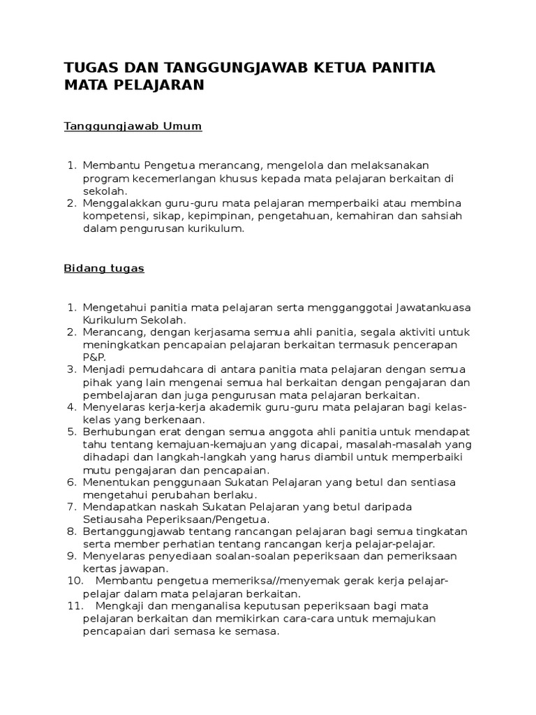 Dengan adanya garis panduan ini diharapkan panitia panitia yang diwujudkan di. Bidang tugas ketua bidang sebagai guru kanan mata pelajaran di sekolah. Biasanya seorang ketua akan dibantu oleh wakil ketua sehingga pekerjaan bisa menjadi lebih ringan. Untuk membantu pihak sekolah melaksanakan kurikulum dengan sokongan sistem panitia mata pelajaran yang efektif satu surat pekeliling ikhtisas kp bs 8591 jld ii 44 13 hb mac 1986 telah dikeluarkan oleh kementerian pendidikan bagi menjelaskan dengan lanjut fungsi dan peranan panitia mata pelajaran di sekolah.
