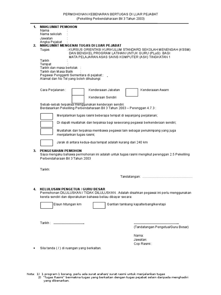 Borang kebenaran bertugas luar pejabat. Permohonan untuk menjalankan tugas tugas rasmi di luar pejabat seperti di atas adalah diluluskan tidak diluluskan. Tugas tugas yang akan dilakukan tempat dan tempoh. Tugas tugas yang dijalankan tempatnya dan tempoh. Borang permohonan untuk bertugas diluar ibu pejabat borang ini hendaklah diisi dalam 2 salinan sebelum perjalanan dilakukan 1.