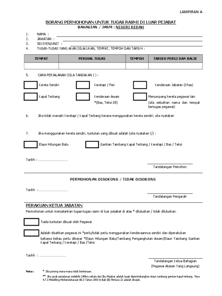 Borang permohonan bertugas di luar pejabat lampiran a. Cara perjalanan sila tandakan. Tempat perihal tugas tempoh tarikh pergi dan balik 5. Nota sila potong mana mana yang tidak berkenaan jarak perjalanan yang melebihi 240 km sehala dari ibu pejabat adalah layak dipertimbangkan elaun tambang gantian kapal terbang atau keretapi. Lampiran a borang permohonan untuk bertugas rasmi di luar pejabat dan kebenaran membawa kenderaan sendiri 1pp wp 1 4 1.
