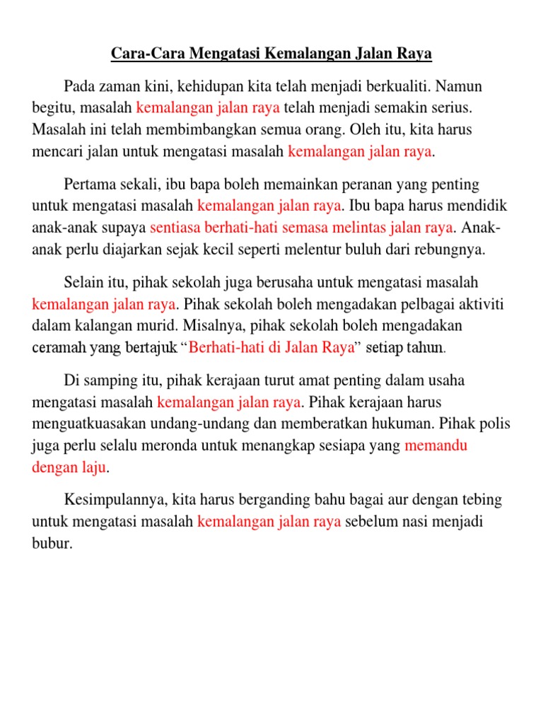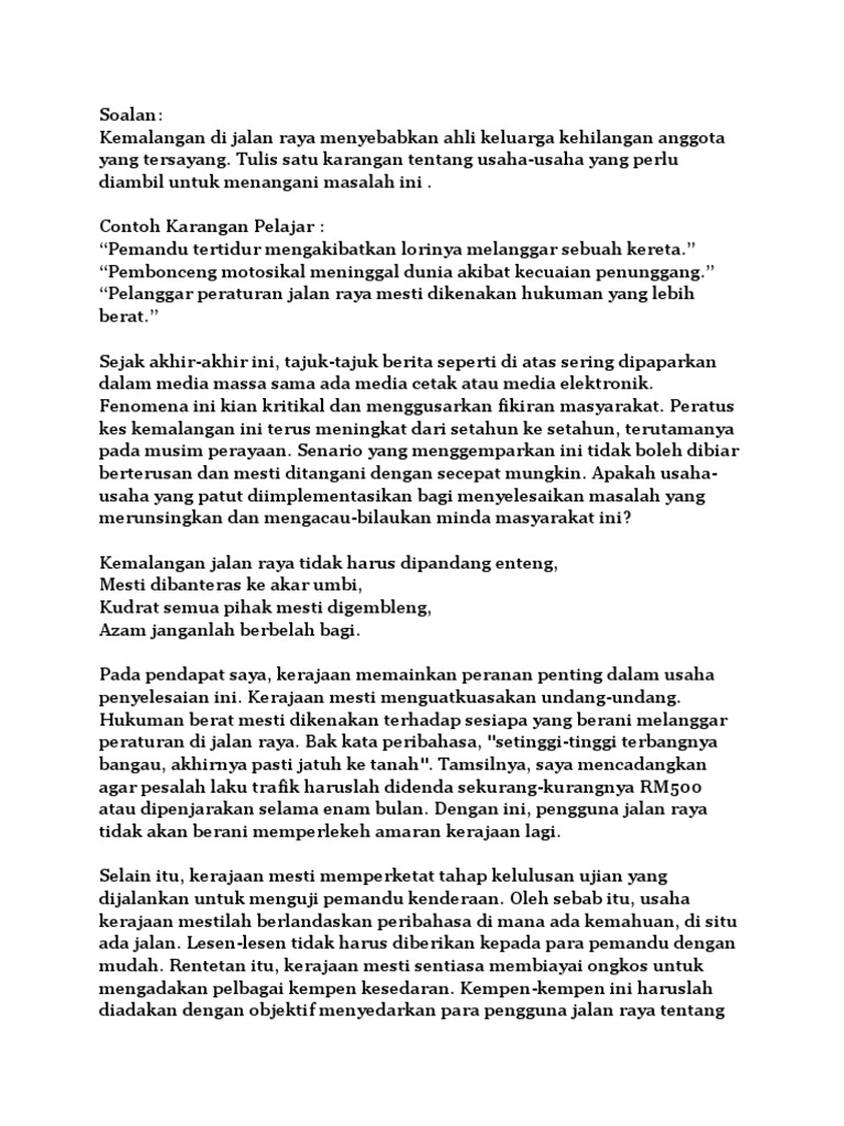 Pelajar dapat mengetahui jenis jenis dan pelbagai contoh karangan yang mengikut tema tema tertentu. Pada 22 ogos yang lalu negara kita dikejutkan dengan berita kemalangan jalan raya yang melibatkan sebuah bas awam dalam perjalanan dari genting hinglands menuju ke pusat bandar raya. Jika kita berhasrat untuk menangani kemalangan jalan raya yang semakin hari semakin serius ini langkah langah yang proaktif dan konkrit haruslah dilaksanakan kerana mencegah itu lebih baik daripada mengubati. Pemandu yang melanggar peraturan jalan raya hendaklah disaman dan didakwa di mahkamah untuk dijadikan pengajaran kepada orang lain.