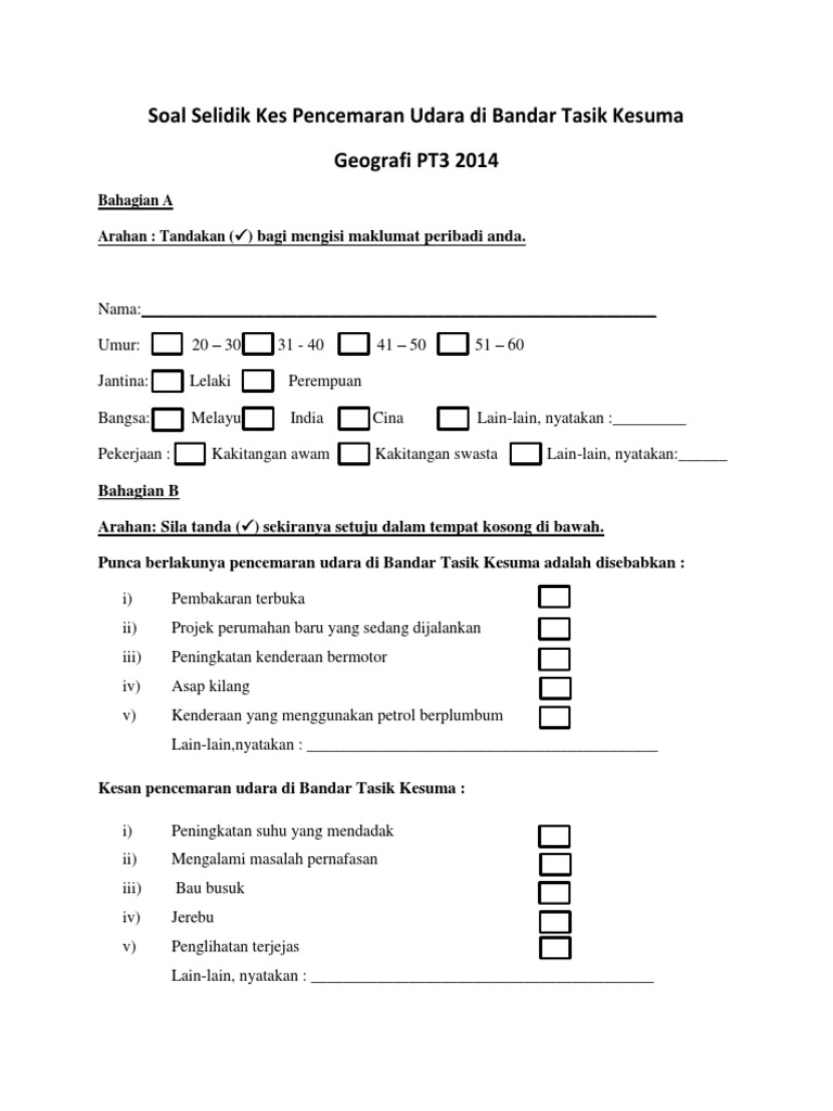 Contoh dan cara buat borang kaji selidik tugasan geografi pt3 tahun 2016 berikut adalah panduan gambaran di antara format borang kaji selidik bagi kerja kursus geografi pt3 tahun 2016 serta contoh perkara perkara yang perlu ada dalam borang soal selidik tersebut. Tahun 2014 merupakan tahun pertama dilaksanakan peperiksaan pentaksiran tingkatan 3 pt3 bagi menggantikan peperiksaan menengah rendah pmr yang diamalkan dan dilaksanakan selama ini dan dalam pada masa yang sama pelajar dan guru dilihat tidak mempunyai masa yang mencukupi untuk membuat persedian secukupnya. Contoh borang soal selidik kegiatan ekonomi borang soal selidik kegiatan ekonomi. Contoh borang soal selidik tugasan geografi pt3 2015 papar berkaitan pada 18 6 2015 jumlah.