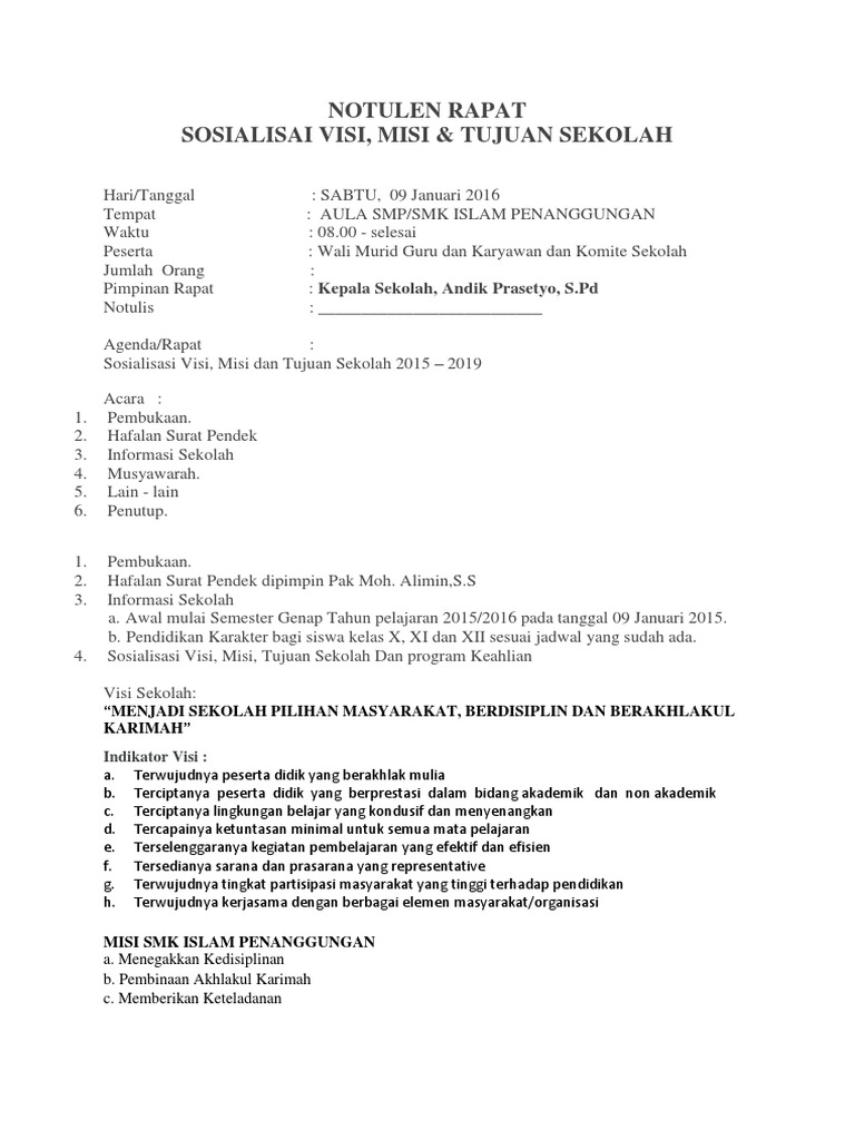 Berita acara notulen daftar hadir sosialisasi visi misi tujuan lembaga paud tk 2018 ini merupakan file terbaru yang akan saya bagikan dalam kesempatan kali ini. Bagikan ke whatsapp sabtu 12 april 2014 01 53 47 wib diposting oleh. Wali murid guru dan karyawan dan komite sekolah. Aula smp smk islam penanggungan.