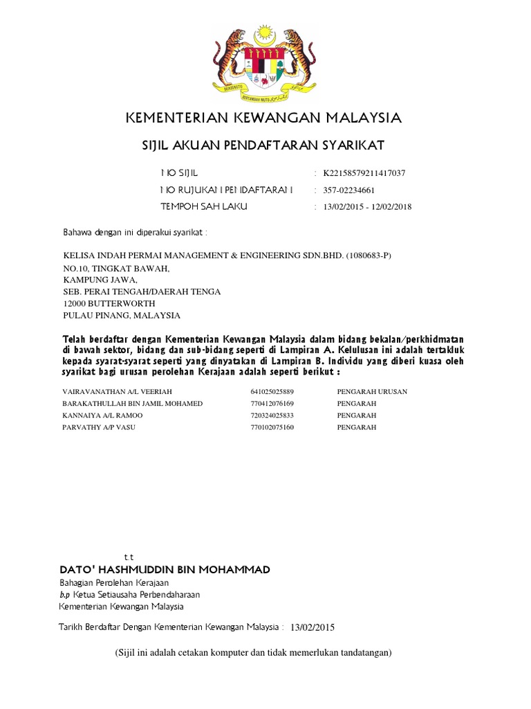 Contoh sijil akuan pendaftaran syarikat. Agensi agensi lain di bawah kementerian perdagangan dalam negeri dan hal ehwal pengguna kpdnhep. 3 salinan sijil borang yang disahkan oleh setiausaha syarikat salinan sijil pendaftaran perniagaan borang 9 dan atau 13 salinan borang 24 salinan borang 49 4 salinan sijil pendaftaran dengan kementerian kewangan malaysia akuan pendaftaran kontraktor akuan pendaftaran kontraktor bumiputera 5 salinan sijil pendaftaran cidb malaysia. Syarikat anda perlu memiliki sijil pendaftaran kementerian kewangan sekiranya ingin berurusniaga dengan kerajaan seperti menyertai sebutharga atau tender bagi setiap pembekalan dan perkhidmatan yang anda tawarkan. Akuan pendaftaran syarikat bumiputera no no rujukan pendaftaran tempoh sah laku bahawa dengan ini diperakui syarikat.