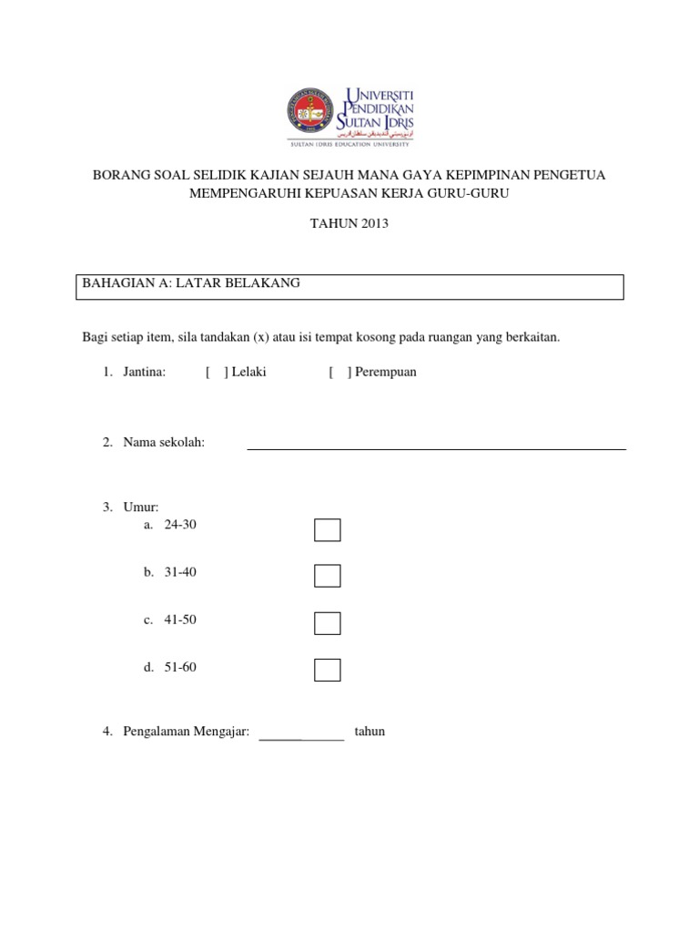 Tekanan kerja di kalangan kakitangan awam di ibupejabat polis kontinjen selangor shah alam sila jawab soalan soalan berikut pada ruang yang disediakan mengikut arahan yang diberi dan tandakan bagi jawapan pilihan. Laporan kajian kepuasan bekerja janm tahun 2012 janm page 4 4 0 keputusan kajian kepuasan bekerja janm tahun 2012 analisis keputusan soal selidik kepuasan bekerja ini adalah berdasarkan kepada tiga aspek utama iaitu mengenai iklim organisasi kepuasan kerja serta kelengkapan pejabat dan kemudahan fizikal lain yang terdapat di pejabat. Profil ringkas responden 1. Borang soal selidik kajian tajuk.