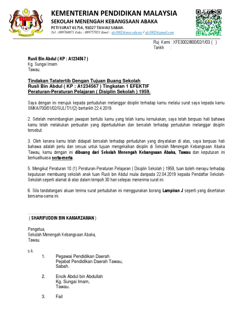 Contoh surat buang sekolah. Bersama sama dengan surat ini saya sertakan salinan keputusan pmr saya sebagairujukan pihak tuan puan 5. Contoh surat buang sekolah sekolah menengah kebangsaan sultan idris shah ii 33300 gerik tel. Contoh surat rasmi buang sekolah in addition it will feature a picture of a kind that could be seen in the gallery of contoh surat rasmi buang sekolah. Mengikut peraturan 10 1 peraturan peraturan pelajaran disiplin sekolah 1959 tuan boleh merayu terhadap keputusan membuang sekolah anak tuan rusli bin abdul mulai daripada 19 9 1991 kepada pendaftar sekolah sekolah seperti alamat di atas dalam tempoh 30 hari selepas menerima surat ini.