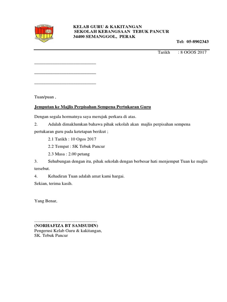 Contoh surat jemputan majlis perpisahan guru have an image associated with the other contoh surat jemputan majlis perpisahan guru in addition it will feature a picture of a sort that might be seen in the gallery of contoh surat jemputan. Tuan haji mohd zawawi bin mat junoh. Contoh surat jemputan smk demak baru. 19 oktober 2010 kepada guru besar sk.