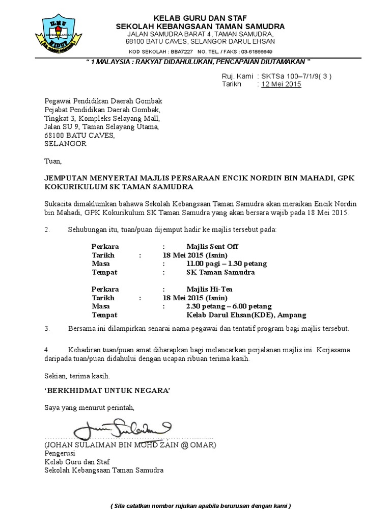 Ketua ketua unit pejabat pendidikan daerah kluang pengerusi majlis guru besar daerah kluang guru guru besar sekolah rendah daerah kluang. Contoh surat jemputan majlis perpisahan guru have an image associated with the other contoh surat jemputan majlis perpisahan guru in addition it will feature a picture of a sort that might be seen in the gallery of contoh surat jemputan majlis perpisahan guru. Jemputan ke majlis persaraan guru besar skpt 2016. 2 0 untuk makluman tuan pihak pengelola karnival bola sepak 9 sebelah peringkat daerah kuala pilah tahun.