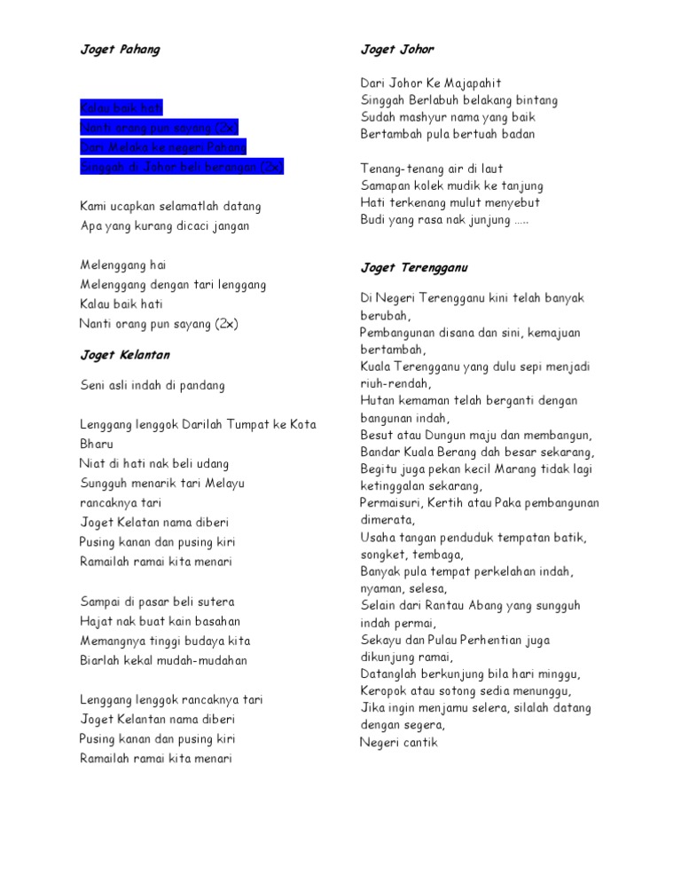 Dari melaka ke negeri pahang singgah di johor beli berangan. Melenggang hai melenggang dengan tari lenggang kalau baik hati nanti orang pun sayang 2x dari melaka ke negeri pahang singgah di johor beli berangan 2x kami ucapkan selamatlah datang apa yang kurang dicaci jangan. Dari melaka ke negeri pahang singgah di johor beli berangan kami ucapkan selamat datang apa yang kurang dikeji jangan jamuan nasi didalam pinggan. Negeri pahang aman sentosa kaya dengan tumbuh tumbuhan niat di hati nak buat jasa mudah mudahan tuhan kabulkan. Pukul gendang kulit kerbau dalam majlis tari menari kami ini daganglah merantau mengharap belas orang di sini.