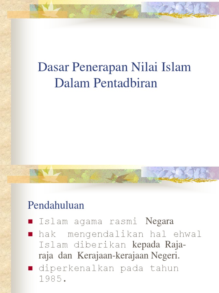 Dasar penerapan nilai nilai islam dalam pentadbiran pdf. Dasar penerapan nilai islam. Dalam pentadbiran pendahuluan islam agama rasmi negara hak mengendalikan hal ehwal islam diberikan kepada raja raja dan kerajaan kerajaan negeri. Menghapuskan sikap negatif spt. Dasar penerapan nilai nilai islam diperkenalkan oleh pm 1983 usaha kerajaan untuk menerapkan unsur unsur agama islam dalam pentadbiran dan kehidupan rakyat m sia.