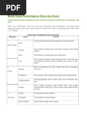 Gaya pembelajaran dunn dan dunn. Pelajar yang tahu menggunakan gaya pembelajaran yang sesuai dengan dirinya akan lebih mudah membantu mereka mencapai keputusan yang lebih cemerlang. Menurut dunn dunn lagi adalah penting untuk bukan sahaja untuk mengenal pasti tingkah laku individu tetapi juga untuk mengkaji kecenderungan seseorang itu terhadap pembelajaran. Dunn thies dan honigsfeld 2001. Gaya pembelajaran model dunn dunn disediakan oleh.
