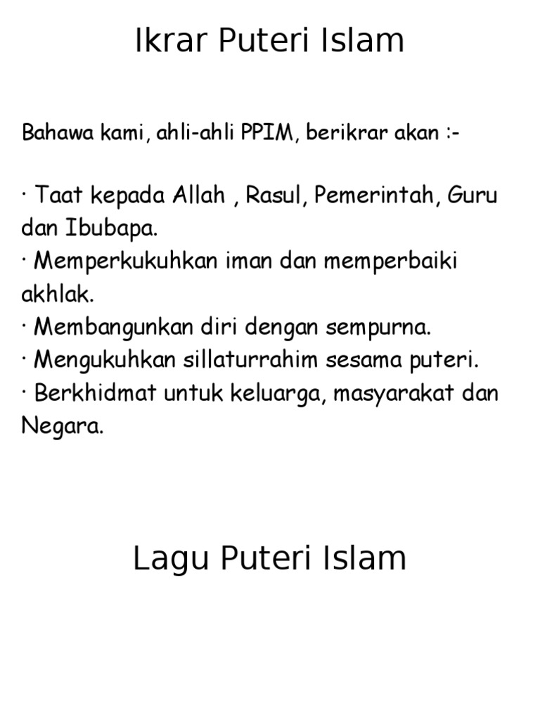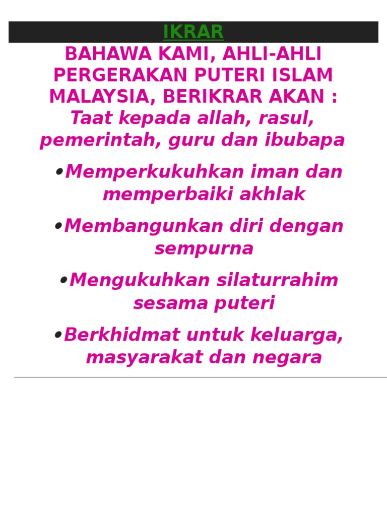 Ikrar pergerakan puteri islam malaysia. Berikrar akan taat kepada allah rasul pemerintah guru dan ibubapa memperkukuhkan iman dan memperbaiki akhlak membangunkan diri dengan sempurna. Pergerakan puteri islam malaysia sejarah penubuhan puteri islam visi dan misi puteri islam lagu rasmi pergerakan puteri is. Kamilah puteri pejuang. Taat kepada pemerintah guru dan ibubapa.