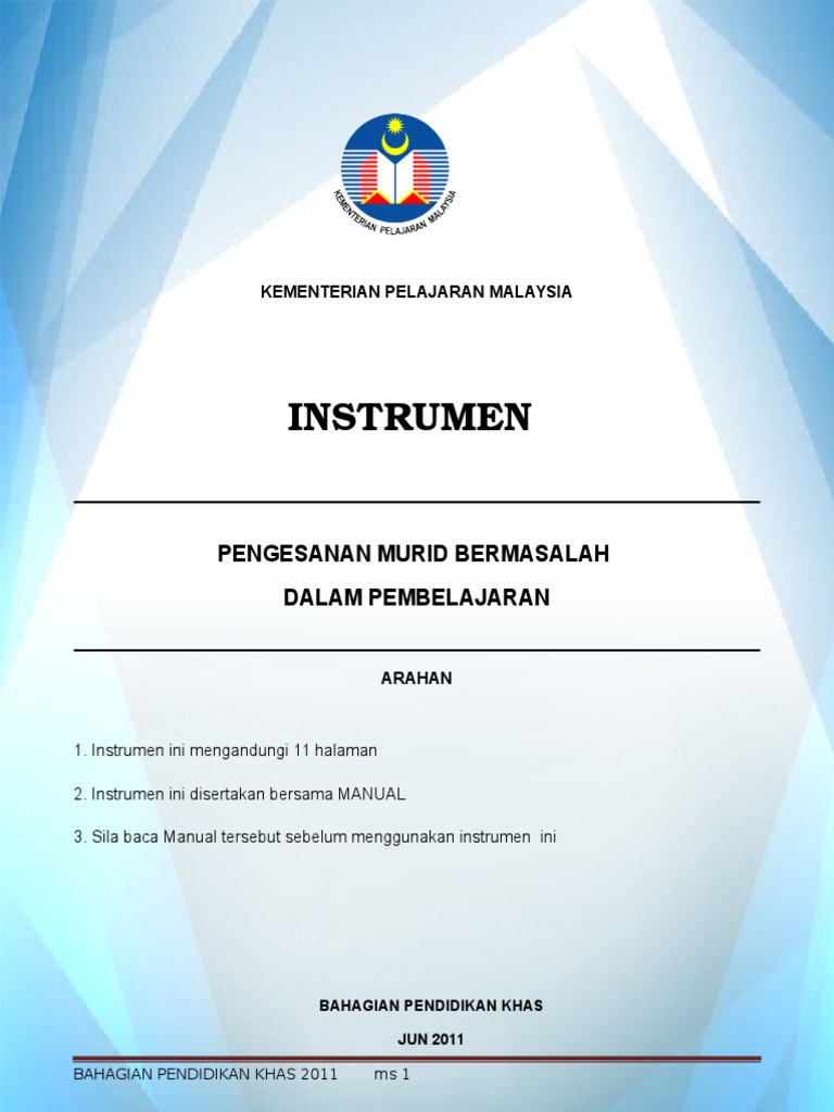 Instrumen pengesanan murid bermasalah dalam pembelajaran jun 2011. Instrumen ini bertujuan membantu guru mengesan murid yang mempunyai masalah dalam pembelajaran. Kepada sekolah sekolah yang mempunyai murid linus tegar saringan 4 2011 sila muat turun bahan bahan berkaitan instrumen pengesanan murid bermasalah dalam pembelajaran. Instrumen ini disertakan bersama manual. Sila baca manual tersebut sebelum menggunakan instrumen ini bahagian pendidikan khas tahun 2011.