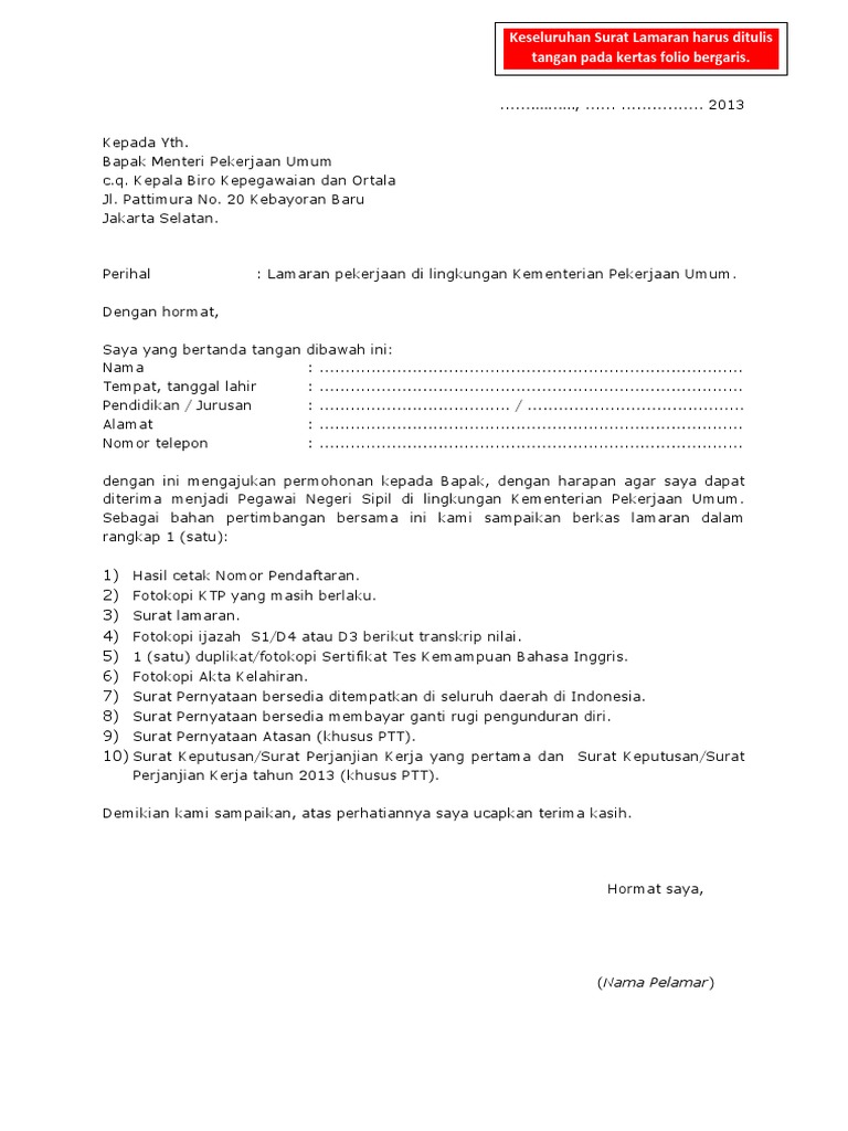 1 lembar kertas ini menjadi syarat mutlak dan wajib dilampirkan sebab dari sinilah pelamar kerja memperkenalkan dirinya secara singkat mengenai apa saja. Contoh surat lamaran kerja cpns kemenkumham tulis tangan sederhana seperti yang kita ketahui bersama bahwa kementerian hukum dan hak asasi manusia republik indonesia memberikan kesempatan kepada warga negara republik indonesia untuk mengikuti seleksi cpns yang akan ditugaskan dalam lingkungan kementerian hukum dan ham. Contoh surat lamaran cpns kemendikbud 2019 untuk formasi dosen ditulis dengan tangan. Setidaknya anda menyediakan 3 hingga 4 lembar kertas folio bergaris.