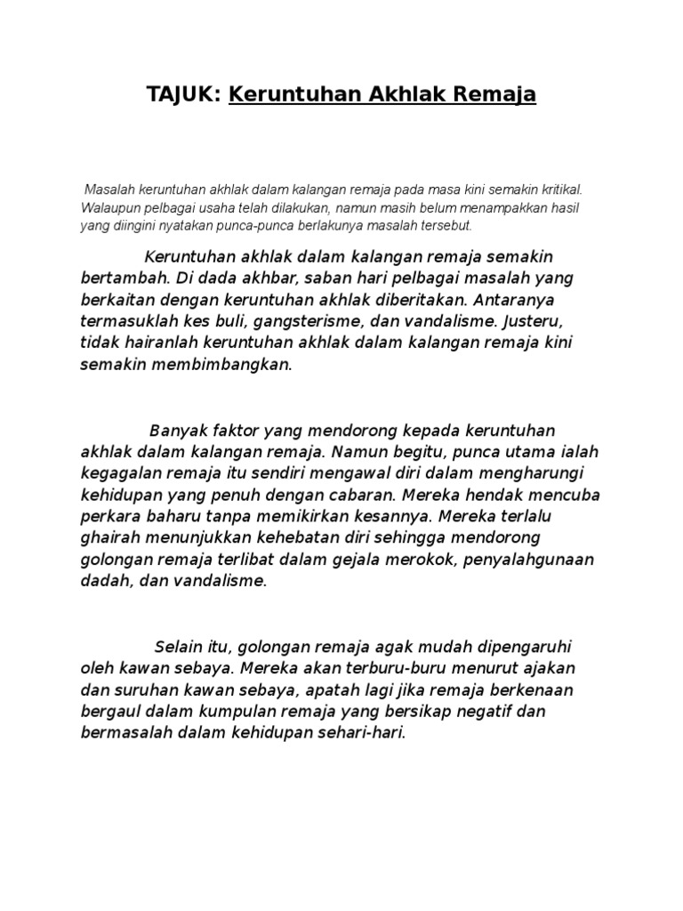 Oleh itu golongan remaja yang cemerlang sangat diperlukan untuk membentuk sesebuah negara yang berjaya. Faktor yang boleh mengakibatkan berlakunya keruntuhan akhlak di kalangan remaja. Sarmila a p ravi golongan belia sememangnya tidak dapat lari daripada terdedah kepada masalah masalah sosial yang berlaku dalam suasana di persekitaraan pada hari ini. Keruntuhan akhlak remaja juga dapat dilihat daripada pelbagai sudut dan banyak puncanya.