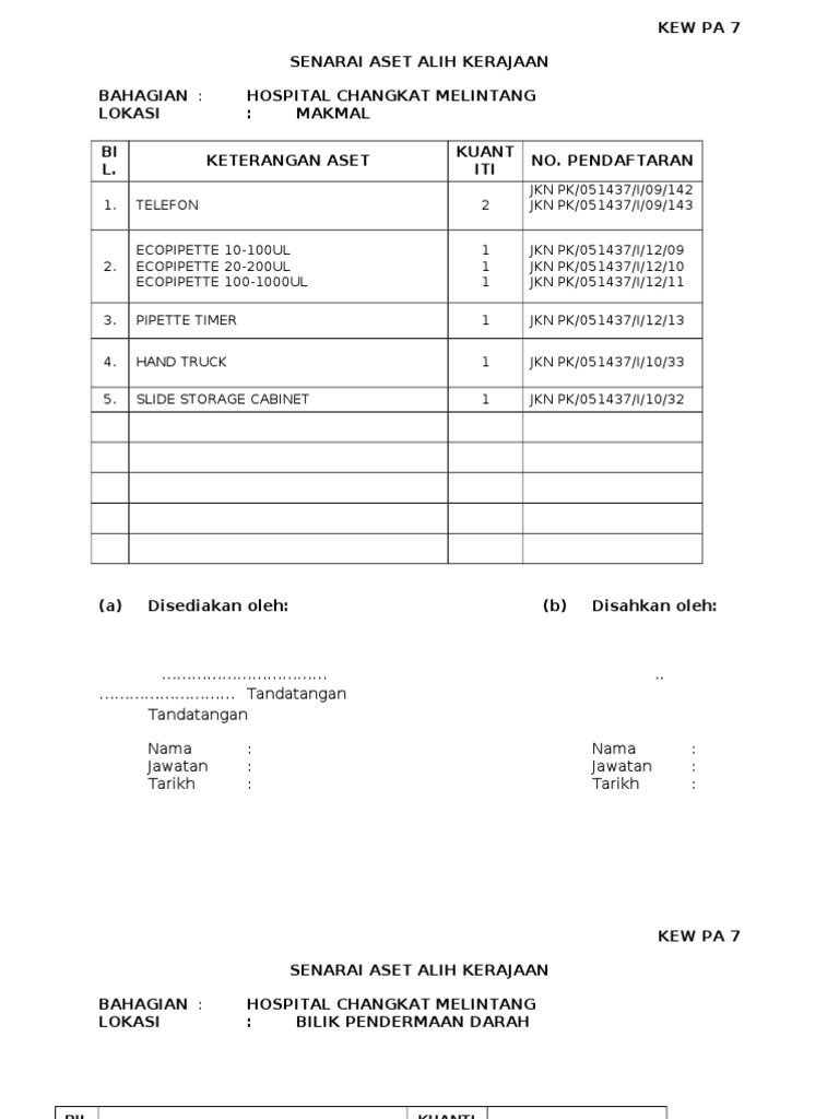 Kew pa 7 terbaru. 7 kew pa 7 senarai aset di lokasi sk jalan haji baki. 8 3 ptj penerima hendaklah membuat penempatan ke atas aset alih dan menyediakan kew pa 7 secara berasingan. Kew pa 7senarai aset alih kerajaanbahagian. Microsoft word document 47 5 kb.