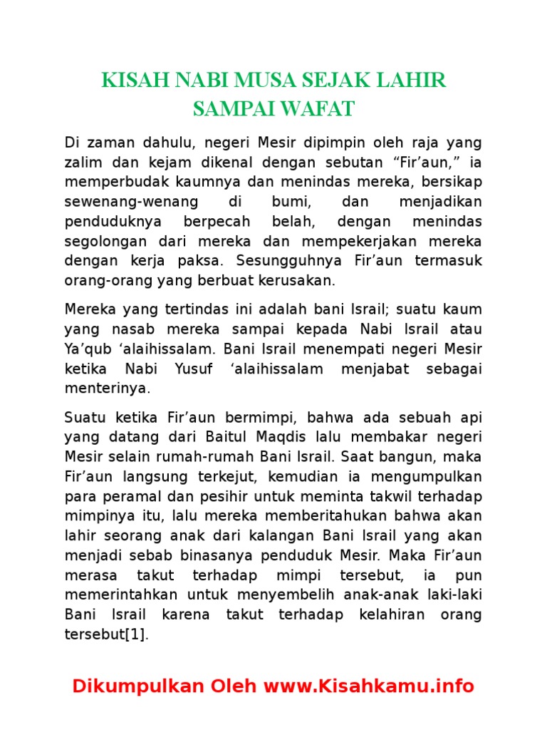 Kisah nabi musa lengkap dari lahir sampai wafat. Qorun adalah saudara ayahnya. Nabi muhammad saw dilahirkan di mekkah pada tahun 570 m yaitu pada tahun yang sama ketika raja abrahah dari yaman melakukan penyerbuan ke mekkah dengan maksud untuk menghancurkan kakbah tahun tersebut juga dinamakan sebagai tahun gajah karena pasukan penyerang raja abrahah menggunakan gajah sebagai tunggangannya. Di tahun inilah nabi muhammad saw lahir di makkah dan dibesarkan sebagai anak yatim karena abdullah ayah nabi muhammad wafat sebelum rasulullah saw lahir. Kali ini dutadakwah akan membahas mengenai kisah nabi musa as.