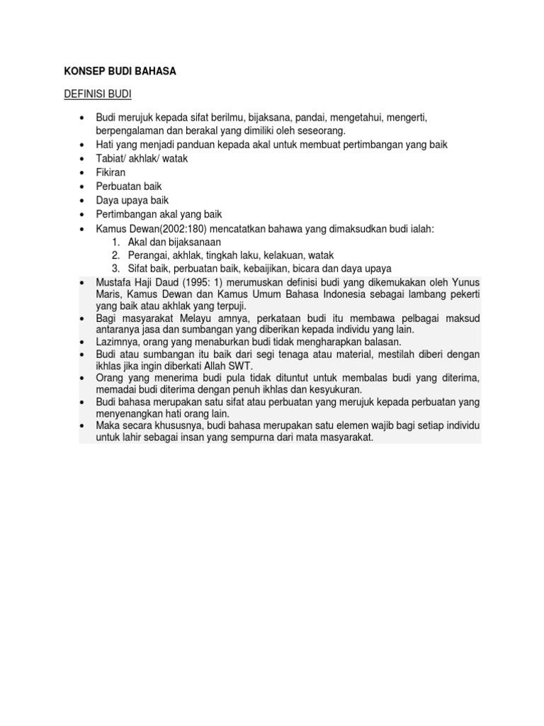 Konsep budi bahasa pdf. Bahasa indonesia mampu mempersatukan para pemuda dari seluruh penjuru tanah air dalam hal berkomunikasi untuk berjuang melawan penjajah. Sudah terang lagi bersuluh. Tegak rumah kerana sendi runtuh sendi rumah binasa sendi bangsa ialah budi runtuh budi runtuh lah bangsa budi bahasa budaya kita merupakan satu ungkapan yang tidak asing lagi didengar oleh rakyat malaysia. Istilah budi membawa maksud asli pertama sejati dan dipandang sempurna manakala daya pula dimaksudkan sebagai akal jalan fikiran dan ciptaan rohana yusof 2010.
