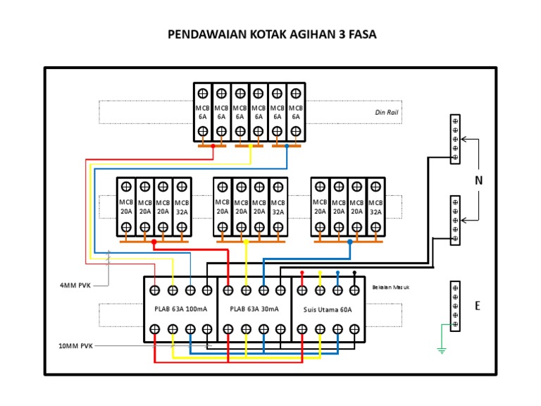 Kotak agihan 1 fasa. Untuk bekalan 3 fasa ia menggunakan suis 3 kutub berangkai. Terhindar dripada banjir atau dekat dengan punca air 2. Kotak agihan db satu fasa yang biasa tidak dapat memenuhi kehendak permintaan beban tersebut jadi kotak agihan tiga fasa akan dipasang ke litar itu. Bekalan ini diperolehi daripada sambungan antara talian sama ada r y atau b dan neutral dari sistem 3 fasa 4 dawai sambungan y.