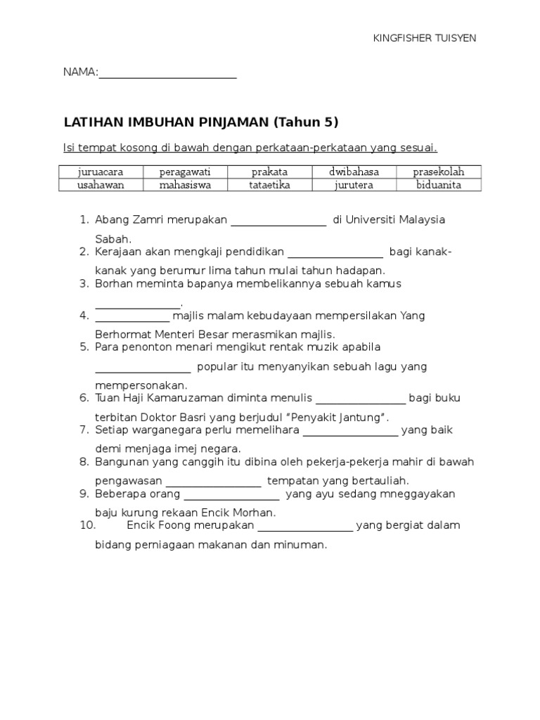 Latihan kata imbuhan pinjaman tahun 5. Bahasa melayu bm grade level. Imbuhan pinjaman imbuhan pinjaman atau imbuhan asing ialah imbuhan yang dipinjam daripada imbuhan. Melalui penggunaan ict para guru boleh memaksimumkan penambahan perkongsian pembelajaran secara online sama ada pembelajaran secara jarak jauh atau pembelajaran kendiri tanpa mengambil kira lokasi dan tahap. 10000 keputusan untuk imbuhan kata pinjaman tahun 5 game 4 kata pinjaman bahasa inggeris silang kata.