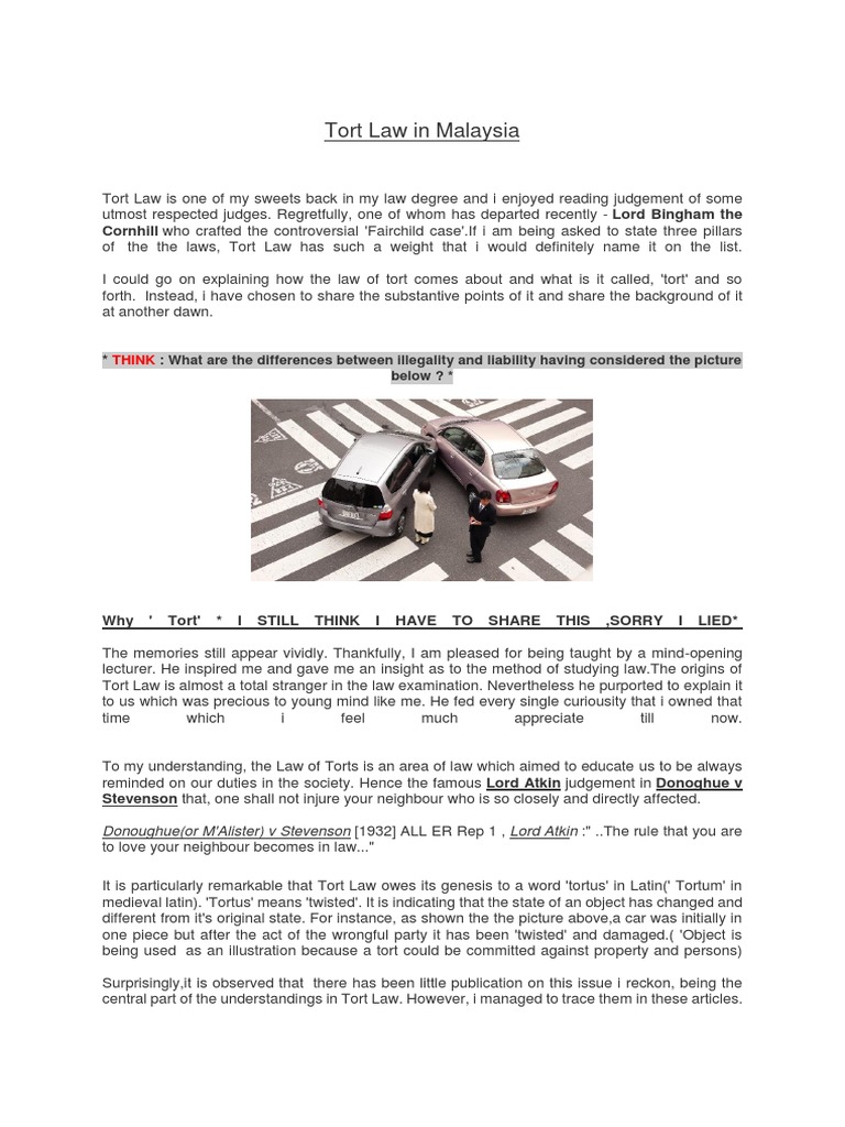 Torts have been defined as an injury other than breach of contract which the law will redress with damages a body of law which has been developed by the common law. One can clearly identify this situation where in the pass few years not all the changes in england have been reflected in malaysia. Conclusion tort law changes very fast. Tidak seperti kebanyakkan undang undang lain di malaysia yang menggunakan peruntukan statut sebagai sumber utama prinsip undang undang tort boleh dilihat pada common law inggeris dan keputusan keputusan mahkamah atau judicial precedent.