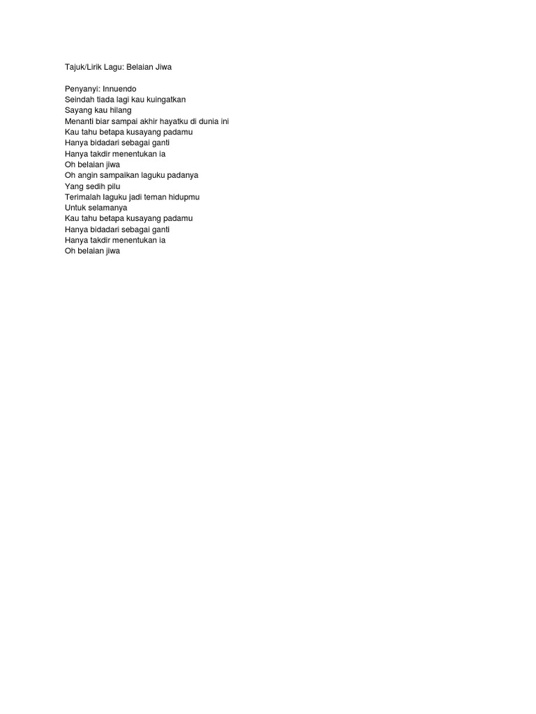 Innuendo belaian jiwa seindah tiada lagi kau kuingatkan sayang kau hilang menanti biar sampai akhir hayatku di dunia ini kau tahu betapa kusayang padamu hanya bidadari sebagai ganti hanya takdir menentukan ia oh belaian jiwa. Watch official video print or download text in pdf. Chorus kau tahu betapa ku sayang padamu hanya bidadari sebagai ganti hanya takdir menentukan ia oh belaian jiwa. Seindah tiada lagi kau ku ingatkan sayang kau hilang menanti biar sampai akhir hayat ku di dunia ini.