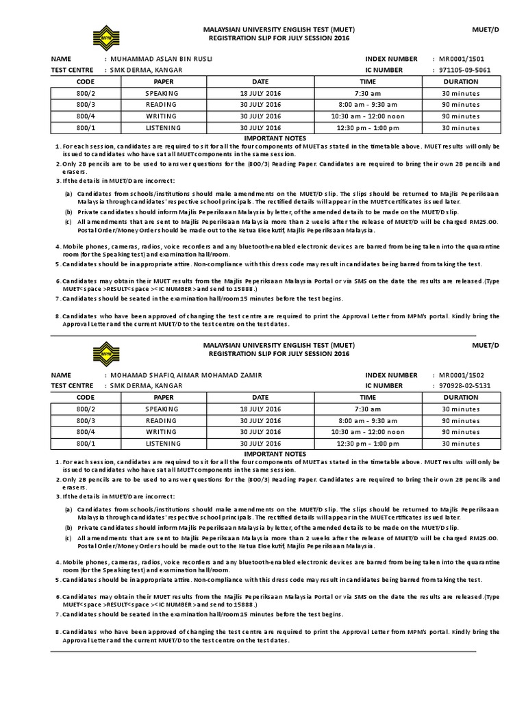 Majlis peperiksaan malaysia muet slip. Please click the icons below for a faster and speedy communication. Calon perlu melengkapkan borang permohonan salinan sijil stpm muet mpm s2 dan menghantarnya ke majlis peperiksaan malaysia mpm bersama sama dengan bayaran sebanyak rm40 00. View registration slip pdf from it 007 at sana a university. Untuk mendapatkan muet s2 sila klik di sini.