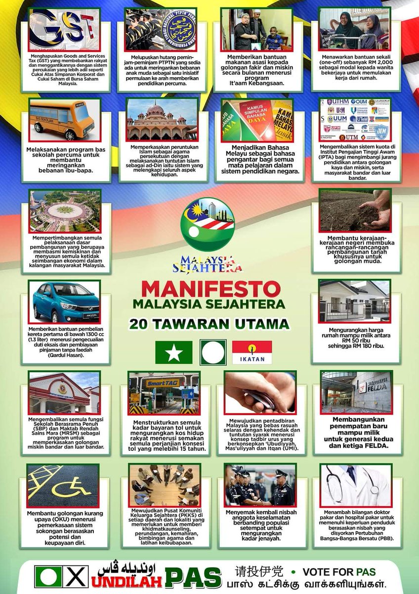 400 hits kota bharu 7 syaaban 1439h isnin 8211 pas kelantan hari ini melancarkan manifesto bagi pilihan raya umum ke 14 dengan 14 tawaran kepada rakyat manifesto dengan sembilan teras bertemakan 8216 kelantan sejahtera untuk islam yang selari den. 7hb april 2018 tepat jam 8 45 malam bertempat di arena axiata pengerusi barisan nasional dato sri mohd. Katanya tawaran tersebut adalah perkara yang menyentuh perasaan dan kehidupan rakyat yang akan dilaksanakan apabila pas diberikan kepercayaan menjadi kerajaan selepas pilihan. Adalah akujanji yang akan di tepati.