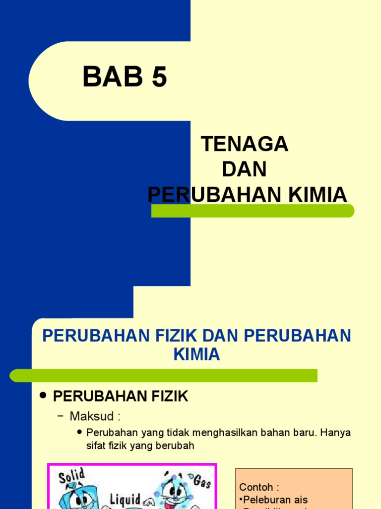 Nota sains tingkatan 4 bab 5 tenaga dan perubahan kimia. Sains tingkatan 4 bab 9 kimia industri. Perubahan kimia chemical change dan perubahan fizik physical change melibatkan perubahan pada keadaan jirim sesuatu bahan akibat proses pemecahan atau pembentukan ikatan. Bab 6 tenaga nuklear ramizah azizan.