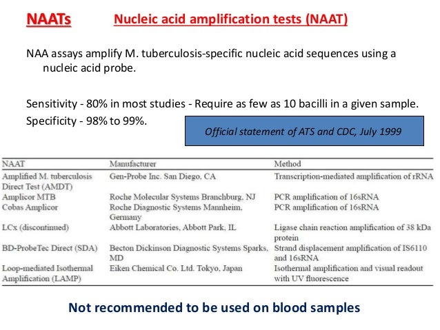 Nucleic acid amplification test tuberculosis. Since then naa testing has become a routine procedure in many institutions for the diagnosis of tb because naa tests can rapidly and reliably detect mycobacterium tuberculosis bacteria directly in a specimen one or more weeks earlier than. Nucleic acid amplification testing may be helpful in determining whether patients who have tested positive for acid fast bacilli have tuberculosis according to the findings of a new study. Diagnosis of pulmonary tuberculosis using pcr assays on sputum collected. It was co developed by the laboratory of professor david alland at the university of medicine and dentistry.