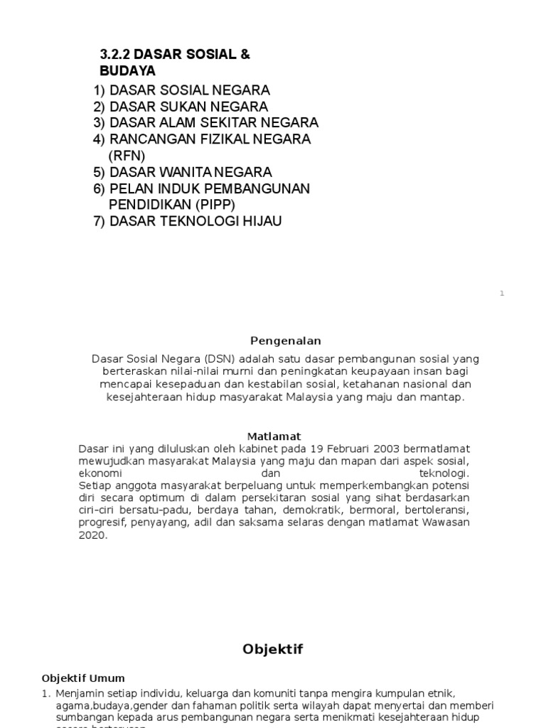 Objektif dasar sosial negara. Dasar sosial negara adalah suatu dasar strategik yang setara dengan dasar dasar utama yang lain seperti dasar ekonomi baru dasar pembangunan nasional dan dasar pembangunan wawasan. Matlamat dasar ini yang diluluskan oleh kabinet pada 19 februari 2003 bermatlamat. Negara objektif gubal dasar 5 kategori dasar ekonomi sosial etika kerja luar negara 6. Pengenalan dasar sosial negara dsn adalah satu dasar pembangunan sosial yang berteraskan nilai nilai murni dan peningkatan keupayaan insan bagi mencapai kesepaduan dankestabilan sosial ketahanan nasional dan kesejahteraan hidup masyarakat malaysia yang maju dan mantap.