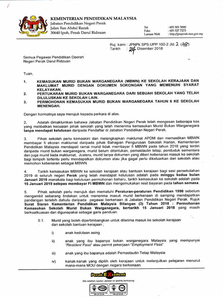 Pendaftaran murid tahun 1 bukan warganegara. Pendaftaran calon bukan warganegara mendaftar sebagai calon peperiksaan upkk telah dibuka bermula 1 januari 2018 sehingga 30 mac 2018. Senarai semak permohonan penerimaan masuk murid bukan warganegara bersekolah di sekolah kerajaan sekolah bantuan kerajaan. A 275 jadual pertama perenggan 5 2 c subperenggan 7 3 akta penddikan 1996 peraturan peraturan pendidikan penerimaan masuk murid ke sekolah penyimpanan daftar dan syarat bagi pengekalan murid belajar di sekolah 1998 permohonan penerimaan masuk murid bukan warganegara ke sekolah kerajaan sekolah bantuan kerajaan. 8 bayaran khas tahun 2019.