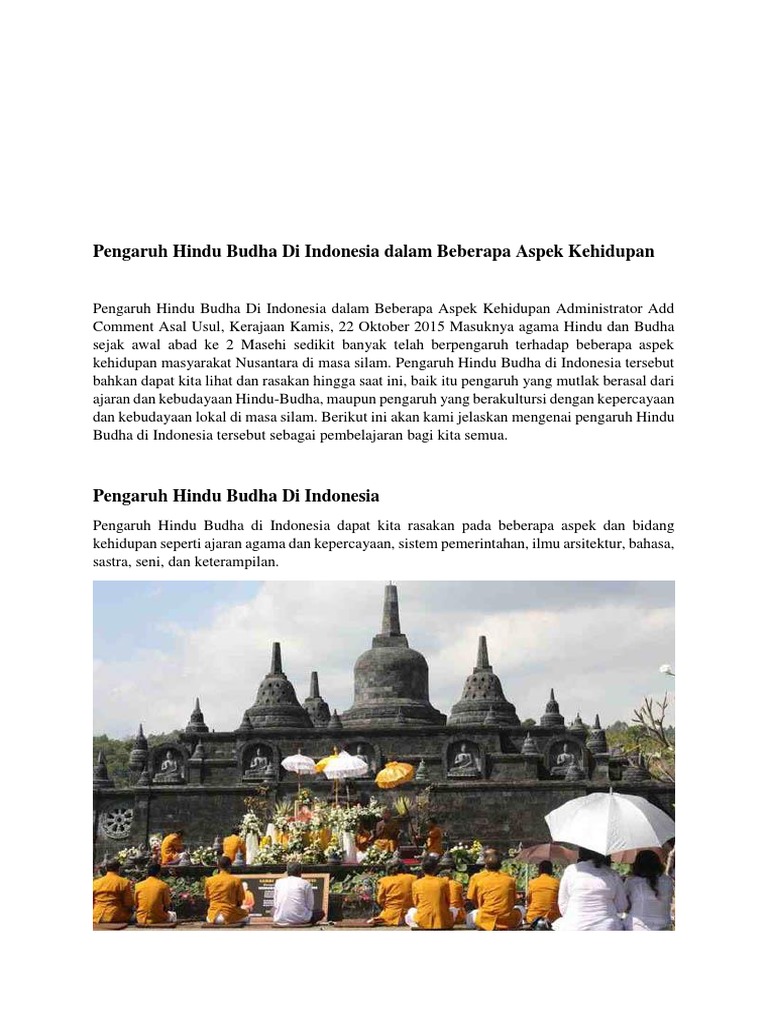 Pengaruh hindu dan budha di indonesia dalam artikel ini kami bagi menjadi 9 bidang yaitu pengaruh hindu budha dalam bidang agama politik dan pemerintahan pendidikan bahasa dan sastra kesenian bangunan patung dan arca struktur masyarakat dan sistem kalender dan penaggalan. Jabatan jabatan ini dapat dirangkap hanya oleh beberapa orang tergantung keinginan raja dan luasnya kerajaan. Pengaruh agama hindhu dan buddha dalam kerajaan awal 1. Seorang daripada mereka bakal menggantikan raja kecuali raja putra.