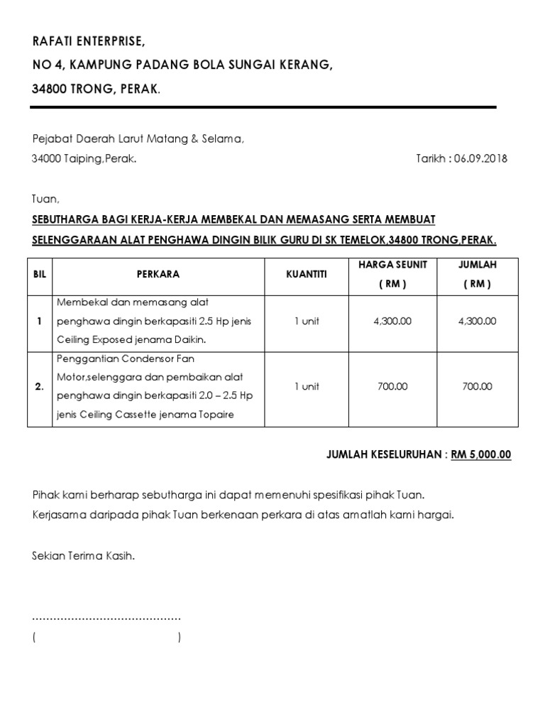 Kalau kena tipu dengan technician yang dapat quotation murah buat cincai dan menipu tapi bayar harga murah dan aircond rosak lagi rugi. We have 11 images about contoh quotation harga including images pictures photos wallpapers and more. Ini hanyalah harga bagi projek sebelum ini harga ini memudahkan tuan puan membuat anggaran bagi projek rumah tuan puan pihak kami akan mengadakan lawatan tapak terlebih dahulu dan akan memberikan sebutharga lain kemungkinan kurang atau lebih bergantung permintaan tuan puan. If you are looking for contoh quotation harga you ve come to the right place.