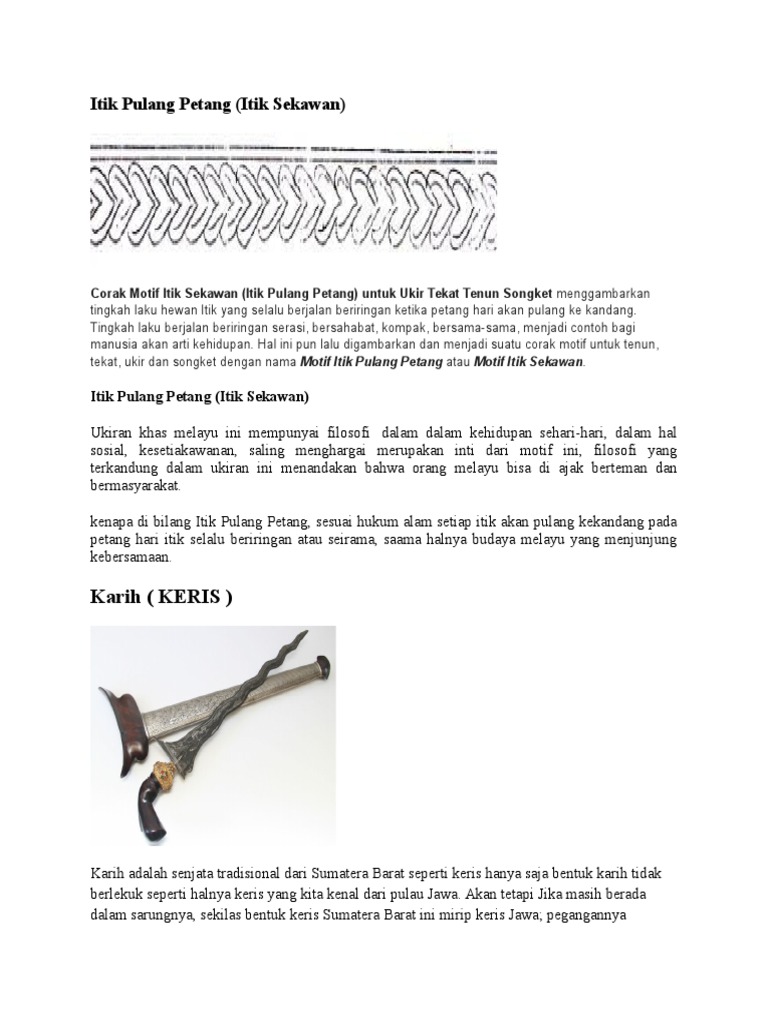 Batik melayu motif itik pulang petang sebagai masyarakat riau seharusnya kita mengetahui kebudayaan riau. Salah satunya adalah corak batik riau. Bagai anjing dengan kucing. Orang yang berjalan lambat.