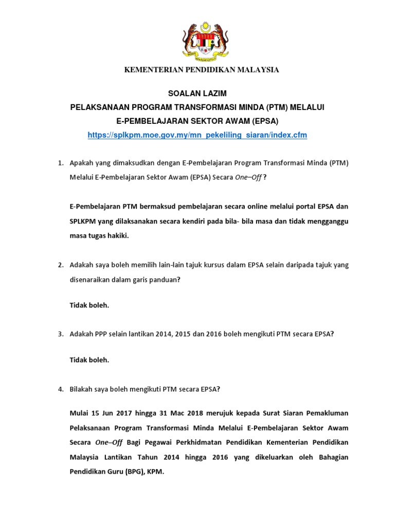 Perenggan 3 1 garis panduan penilaian program transformasi minda lampiran c pp 14 2012 penilaian ptm adalah berasaskan kepada tiga 3 kriteria utama iaitu disiplin dan personaliti 50 markah komitmen 30 markah dan penilaian kefahaman 20 markah. Portal yang memaparkan maklumat pekeliling rujukan dan faq berkaitan program transformasi minda ptm. Aplikasi pengurusan asrama harian kpm e asrama harian sistem maklumat penaziran e nazir sistem maklumat guru program transformasi minda sistem semakan keputusan program transformasi minda ptm sistem semakan status pengecualian program transformasi minda ptm buku pelan pembangunan profesionalisme berterusan guru dan pemimpin sekolah. Siri kursus yang berjaya dijalankan dengan jayanya hasil kerjasama semua pihak pihak yang terlibat menjayakannya.