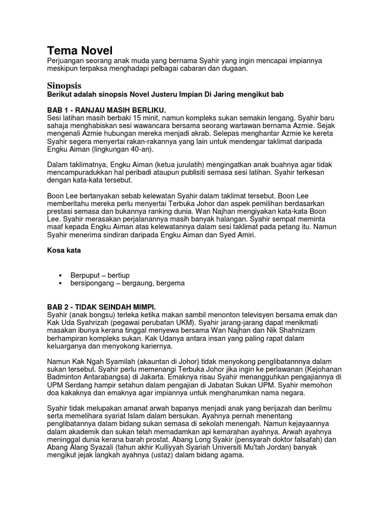 Nota ringkasan bab demi bab novel justeru impian di jaring karya zaid akhtar ting. Sinopsis bab 1 2 novel tingkatan 3 bab 1. Novel justeru impian di jaring papar berkaitan pada 20 1 2017 jumlah. Dia terpaksa berhadapan dengan para pemain muda dari korea selatan indonesia dan china yang tidak pernah ditentangnya sebelum ini.