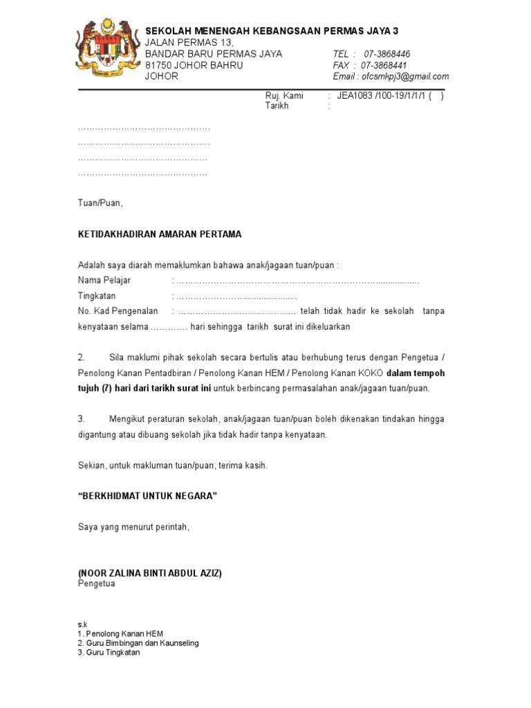 2 jangan sesekali menipu dalam memberikan punca dan sebab anda tidak hadir ke sekolah. Surat rasmi ini juga sangat berguna bagi pelajar untuk meminta izin tidak datang hadir ke sekolah atas sebab tertentu. Surat tidak hadir ke sekolah ditulis dengan format surat kiriman rasmi. Contoh surat amaran tidak hadir sekolah have a graphic from the other contoh surat amaran tidak hadir sekolah in addition it will feature a picture of a sort that could be seen in the gallery of contoh surat amaran tidak hadir sekolah.