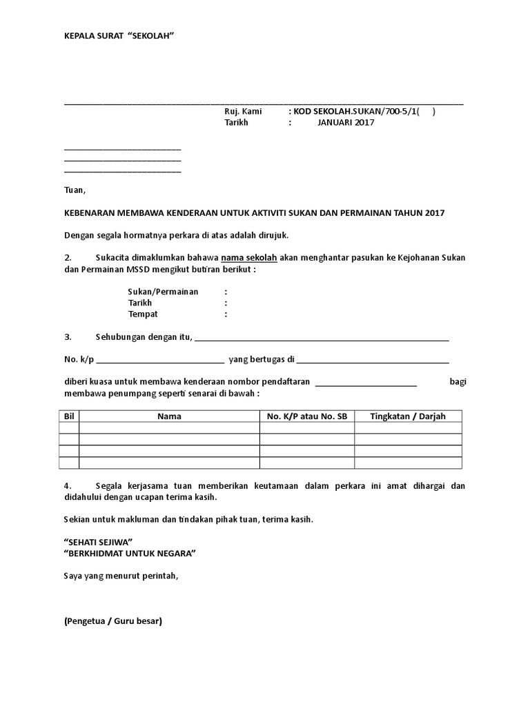Surat kebenaran menggunakan kenderaan membawa murid pelajar ke aktiviti luar sepanjang tahun sekolah iaitu murid pastinya akan banyak terlibat dengan pelbagai program yang diadakan di luar sekolah seperti pertandingan sukan koakademik bahasa melayu dan bahasa inggeris mtaq dan pelbagai lagi. Tuan puan memberi kebenaran menggunakan kenderaan berhubung perkara di atas saya seperti nama yang tertera di atas ingin mengesahkan kebenaran saya kepada mohd hamdi bin abdul halim 830503 02 6089 dari maktab mahmud langkawi untuk menggunakan kenderaan yang telah didaftarkan atas nama saya bermula dari tarikh 22hb hingga 25hb oktober 2015. Prosedur operasi standard sop penggunaan kenderaan sendiri oleh guru untuk membawa murid bagi urusan rasmi kementerian pendidikan malaysia kpm mengikut surat pekeliling ikhtisas kpm bilangan 3 tahun 2019. Kebenaran membawa kenderaan sendiri tambang gantian 10 perkara anda perlu tahu tentang pinjaman ptptn astro awani.