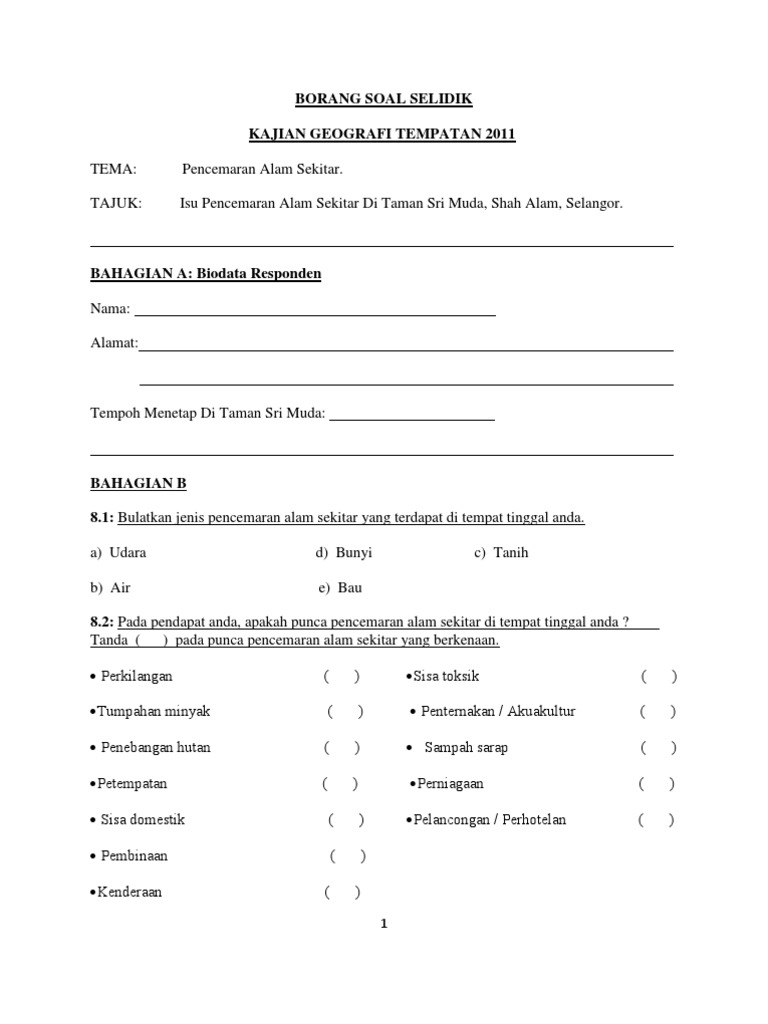 Contoh borang soal selidik geografi tingkatan 1 daripada beckett keery baca tentang contoh borang soal selidik geografi tingkatan 1 ceritaatau lihat contoh borang soal selidik geografi tingkatan 1 sisa domestik 2020 dan seterusnya contoh borang soal selidik kerja lapangan geografi tingkatan 1. Ikut style yg awk suka. Kesan pencemaran alam sekitar di kawasan kajian. Borang soal selidik borang soal selidik.