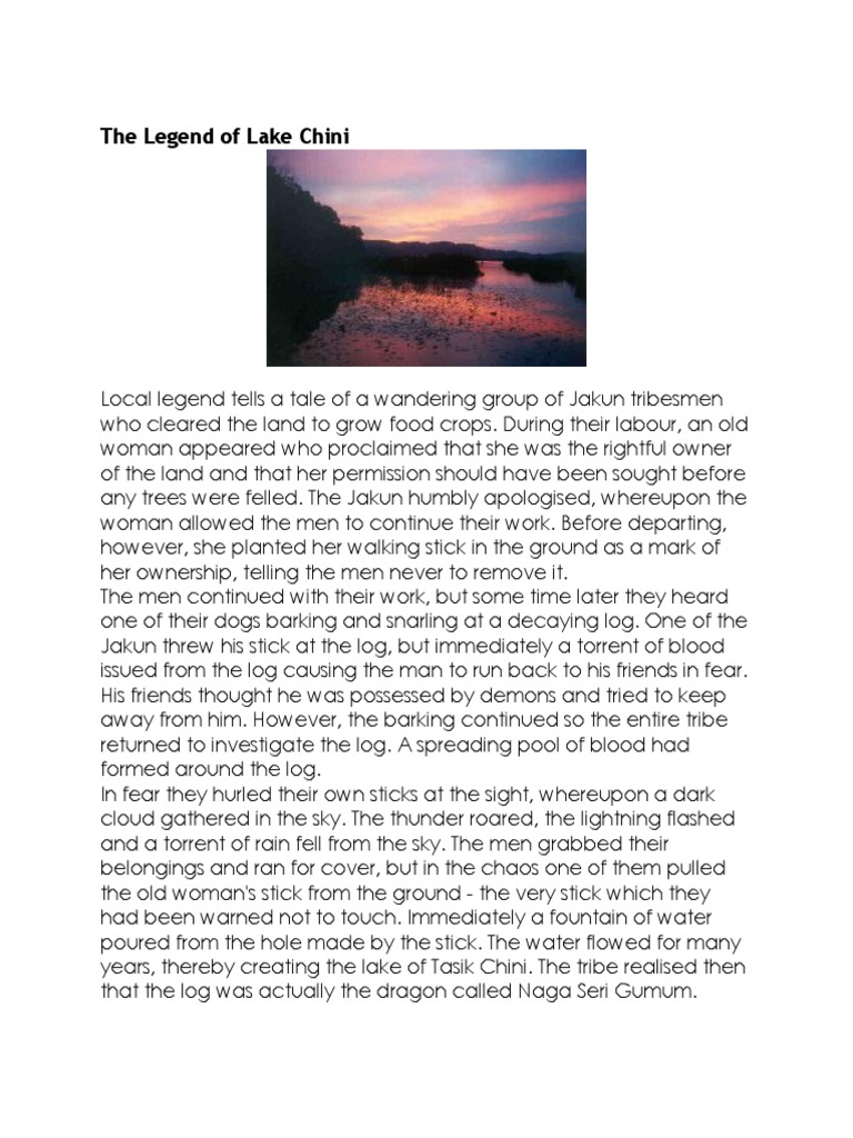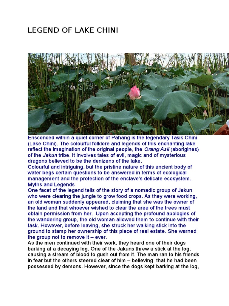 A legend tells us that a sea serpent inhabits one of the lakes called laut gumun. The legend of lake chini local legend tells a tale of a wandering group of jakun tribesmen who cleared the land to grow food crops. The 12 565 acre 5 085 hectare tasik chini is the second largest fresh water lake in peninsular malaysia and is made up of a series of 12 lakes. Tasik chini is the second largest natural lake in malaysia after tasik bera and now tasik chini is a place for eco tourism destination.