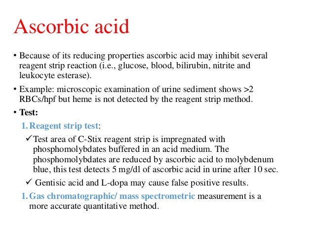 What is ascorbic acid in urine mean. A total of 27 856 samples submitted for urinalysis in previous year were retrospectively analysed from the laboratory information system. 15 previous studies have demonstrated that even modest ingestion of vitamin c supplements 350 1000 mg d can cause high concentration of vitamin c in urine which interferes with dipstick determination of glucose and hemoglobin. The tests have several other parameters on them and one of them is ascorbic acid. For this reason the ascorbic acid status of urine samples should always be rou.
