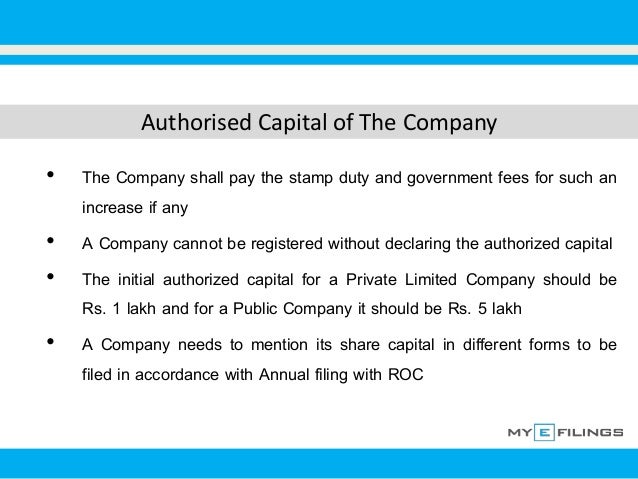 The authorised share capital often referred to as the nominal share capital is the maximum amount of share capital a company can issue to its shareholders according to the company s constitution. A private limited company is limited by shares and is a separate legal entity from its shareholders. Unlike paid up capital these shares may or may have not been fully paid up yet though it is nowadays uncommon for shares to be issued without being fully paid up. And for anything above that you will be paying a stamp duty of inr 400 and as per the amendment in companies act 2015 there is no minimum requirement of paid up capital to start a private limited company.